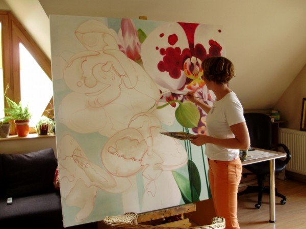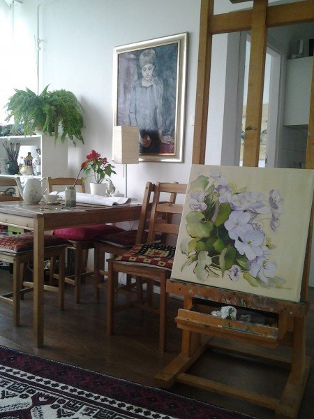 A hideg bekényszerít a szobába, szerencsére így jut egy kis időm az alkotásra is. Törekszem arra amit az idézet szerint Eötvös megfogalmazott. Munka közben hallgatom a rádiót, a déli harangszót, gyermek korom óta mint motívum, allegória, visszavisz a múltbéli ebédekhez. Ecsetemet belemártom a festőszerbe, de a képzeletem a nagymama konyhájában jár, a régi thonett széken ülve kanalazom, hogy a tányér alján újra megláthassam Jancsit és Juliskát. Most egy kis alizarin crimson + ultramarin + fehér, a vásznon halványan látom már a képet, várom hátha újra lesz “Ki nyer ma?” Melegség tölti el szívemet. Az idő megszépítő messzesége! Kitudja, lehet hogy ez a pillanat is emlékezetes lesz. Kihűlt a kávém és a kezem is. Kint újra esik a hó.